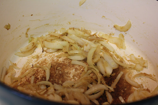 - Slice both onions, heat pot (or dutch oven) with olive oil, and saute until soft.