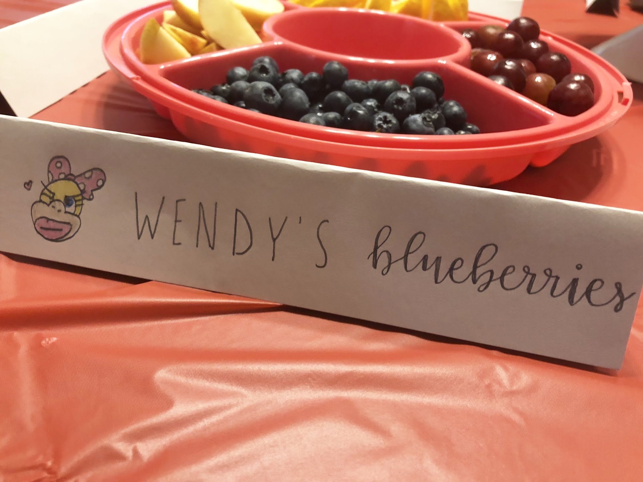 Since Koopa kid decor isn't out there we had to get creative with our food labels. James, being the talented person he is, drew all the Koopa kids while I colored them in. With that we ordered pizza and had a great night with him.